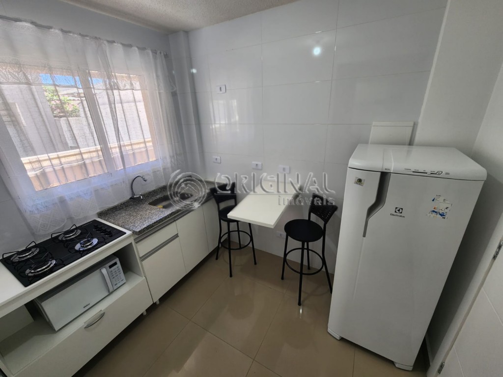 Apartamento novo, Mobiliado, cozinha com armário planejado com fogão Cooktop, mesa de apoio com duas cadeiras, microondas e geladeira, banheiro social com Box blindex, e dormitório com armários planejados com cama box casal
